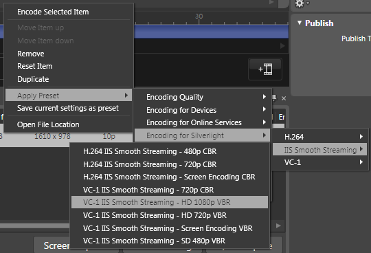 EncoderPlugin\install.cmdfrom an elevated command prompt.Once the plug-in is installed, go to Expression Encoder and set up an encode job to use one of the IIS Smooth Streaming presets.
