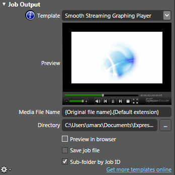 If you want a prepackaged Smooth Streaming player with your content, choose a template in the Job Output area. You might want to uncheck “Preview in browser,” because the publishing plugin also includes an option to launch the browser once publishing is complete.