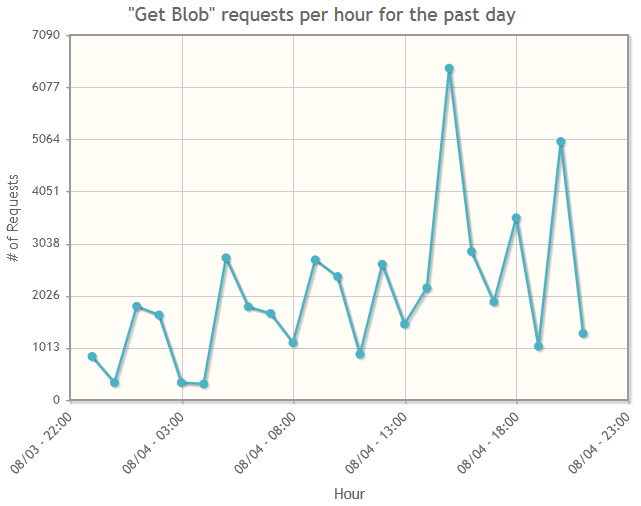 For http://storageanalytics.cloudapp.net, I created just one example of how to use metrics. It draws a graph of “Get Blob” usage over time. Below is a graph of how many “Get Blob” calls have been made via http://netflixpivot.cloudapp.net over the past twenty-four hours. (Note that http://netflixpivot.cloudapp.net is a weird example, since most access goes through a CDN. I think a large number of the requests below are actually generated by the backend, which is doing image processing to construct the Deep Zoom images, involving a high number of calls directly to storage and not through the CDN. This explains the spikiness of the graph, since the images are reconstructed roughly once per hour.)