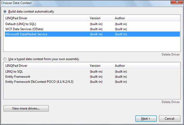 5. Launch LINQPad and click the Add Connection link to open the Choose Data Context dialog. Accept the default Build Data Context automatically option and select the Microsoft DataMarket Service item in the LINQPad Drivers list: