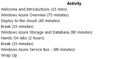 We will start at 9:00 with welcome and introductions and get right into an end-to-end overview of Windows Azure. From there, we’ll participate in a massive, coordinated, global deployment to Windows Azure, teaming with over 60 other worldwide locations to see the workload in action (details are super secret, so you have to show up to get your security clearance- this a a boot camp after all)!