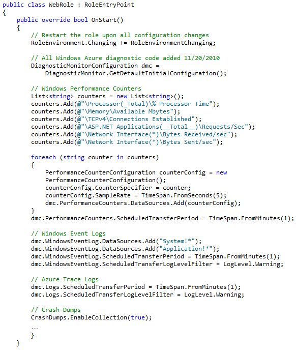 Fortunately, I had enabled collecting Windows Azure Diagnostics for my OakLeaf Systems Azure Table Services Sample Project in November 2011. Following is the source code and configuration data shown in the “Setting up Windows Azure Diagnostics” section of my Adding Trace, Event, Counter and Error Logging to the OakLeaf Systems Azure Table Services Sample Project post of 12/5/2010, updated 11/20/2011: